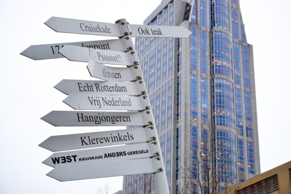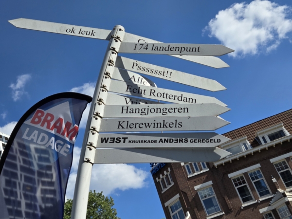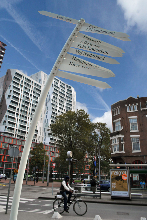 Bij de kruising met het Kruisplein verscheen een karakteristieke, licht gebogen witte wegwijzer. Deze sculptuur, die onder meer naar het ‘174 landenpunt’ verwees, werd al snel een geliefd gespreksonderwerp. Op de borden stonden speelse en creatieve richtingen als “Alle tonen”, “Crusiekade” en “Echt Rotterdam” – humorvolle referenties die de identiteit en het karakter van de straat benadrukten.