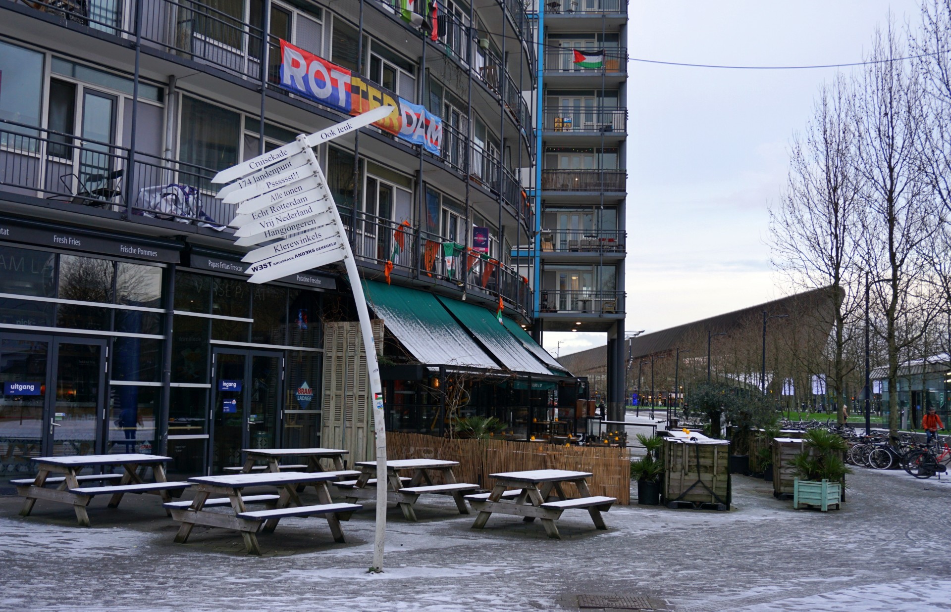 Bij de kruising met het Kruisplein verscheen een karakteristieke, licht gebogen witte wegwijzer. Deze sculptuur, die onder meer naar het ‘174 landenpunt’ verwees, werd al snel een geliefd gespreksonderwerp. Op de borden stonden speelse en creatieve richtingen als “Alle tonen”, “Crusiekade” en “Echt Rotterdam” – humorvolle referenties die de identiteit en het karakter van de straat benadrukten.