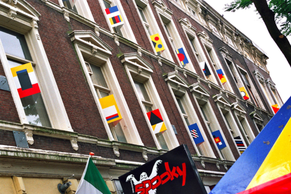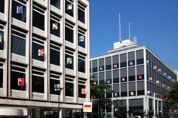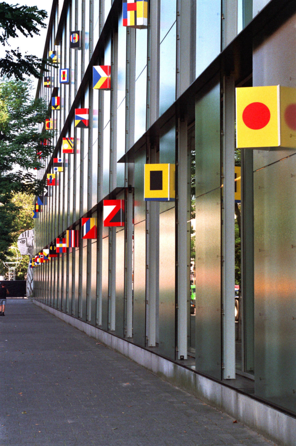 De slogan Awel Zunne – een vrolijke Vlaamse uitdrukking – dook plotseling overal op, als een pop-artachtig motief dat de stad zowel verontrustte als verleidde. In de Witte de Withstraat vormden de borden een kleurrijke route die bezoekers langs galeries en installaties leidde, terwijl de monumentale gevel van Museum Boijmans Van Beuningen het werk letterlijk naar institutionele hoogte tilde. De herkenbare vorm van het tekoopbord, normaal symbool van leegstand of transitie, werd hier omgevormd tot grafische guerrilla: kunst als tijdelijke stadsverovering.