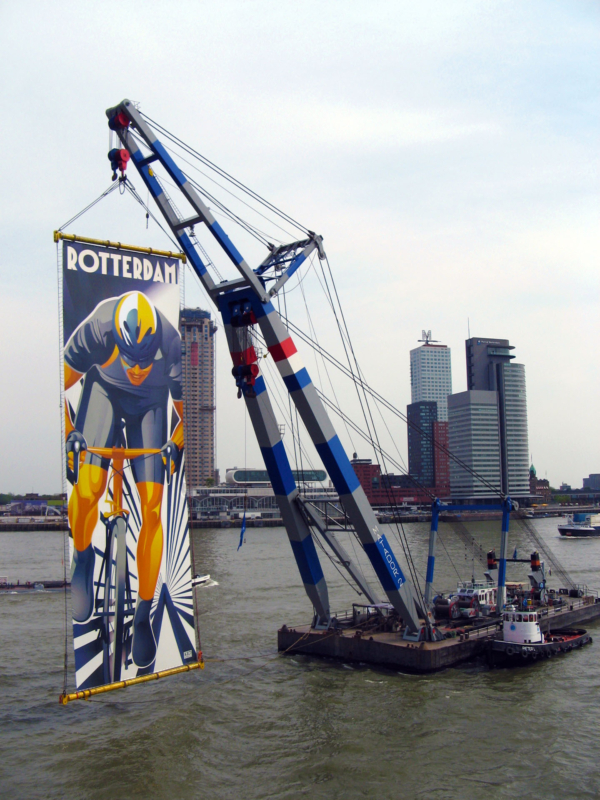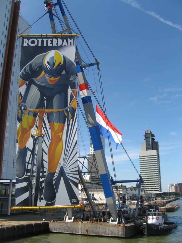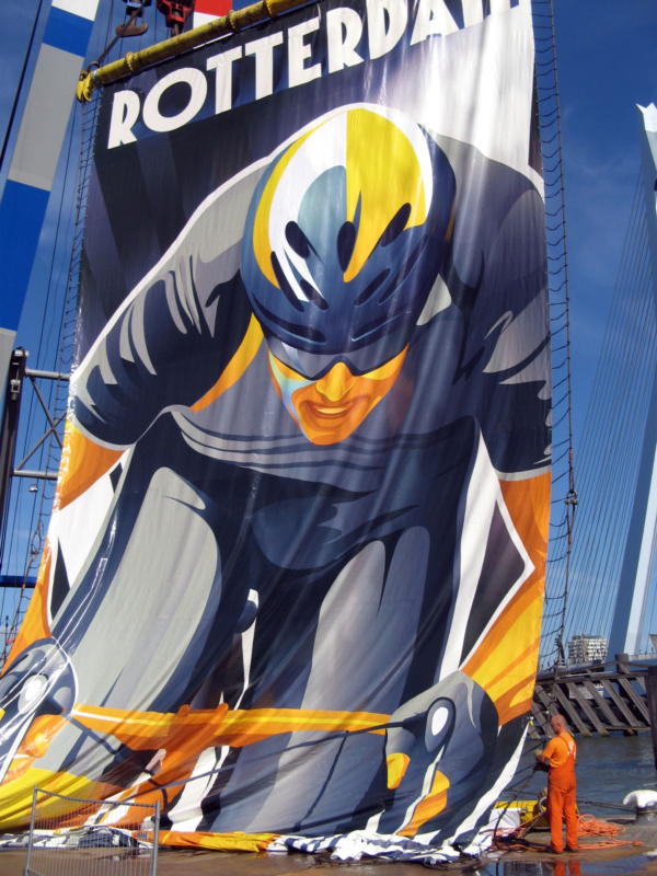 De banner, 10 meter breed en 40 meter hoog, was zo groot als een flatgebouw van tien verdiepingen. De inzet van deze industriële krachtpatser onderstreepte niet alleen de havenidentiteit van Rotterdam, maar gaf ook een monumentale glans aan de start van Le Grand Départ. Het concept is bedacht en uitgevoerd door Mothership. Het werd mede mogelijk gemaakt door Bonn & Mees Drijvende Bokken BV, Blomsma Print & Sign.