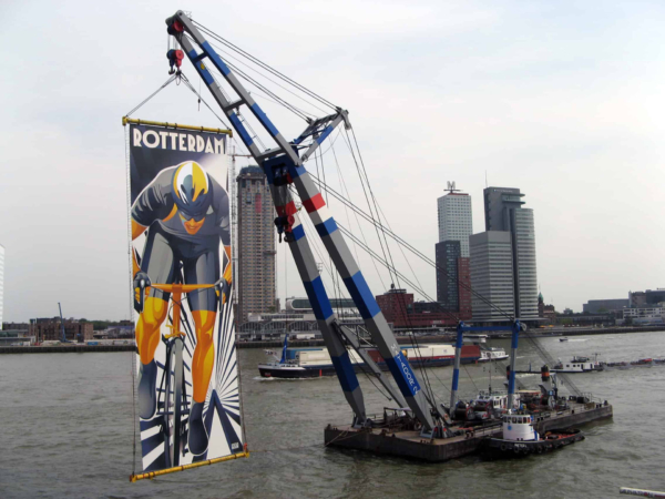 Tijdens de ploegenpresentatie van de Tour de France 2010, die wereldwijd live werd uitgezonden, werd een indrukwekkende banner onthuld aan de skyline van Rotterdam. Kunstenaar Irene Jacobs (I’m Jac Design) ontwierp een gigantische tourbanner die met behulp van een drijvende kraan – typerend voor Europa’s grootste havenstad – hoog boven de Maas uittorende. Deze mobiele hijskraan fungeerde als drager van het kunstwerk en stond als backdrop opgesteld naast de iconische Erasmusbrug.