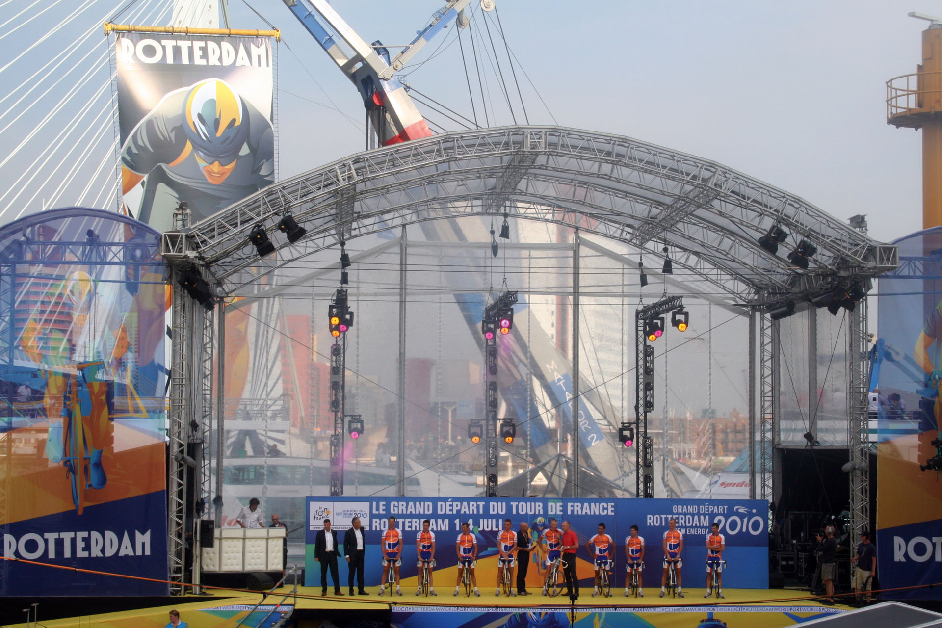 Tijdens de ploegenpresentatie van de Tour de France 2010, die wereldwijd live werd uitgezonden, werd een indrukwekkende banner onthuld aan de skyline van Rotterdam. Kunstenaar Irene Jacobs (I’m Jac Design) ontwierp een gigantische tourbanner die met behulp van een drijvende kraan – typerend voor Europa’s grootste havenstad – hoog boven de Maas uittorende. Deze mobiele hijskraan fungeerde als drager van het kunstwerk en stond als backdrop opgesteld naast de iconische Erasmusbrug.
