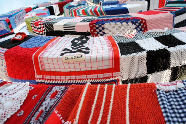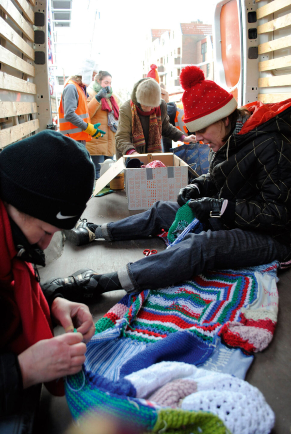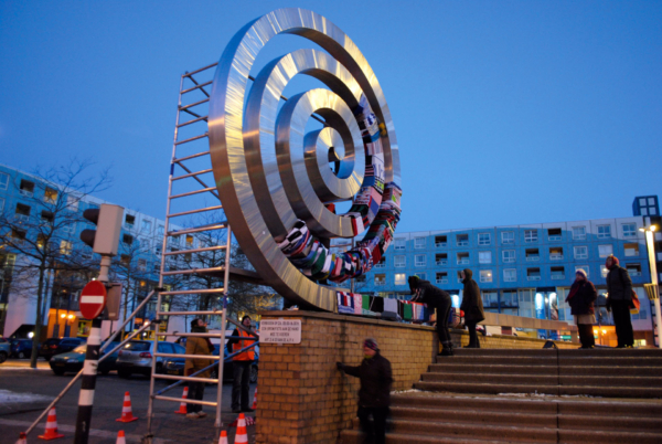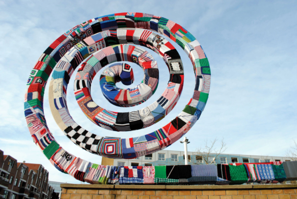 Insteken, omslaan, doorhalen en af laten glijden. Breigraffiti is een zacht maar krachtig antwoord op de vaak ruige graffiti in de stad. In Nieuwegein werkte een groep vrijwilligers – voornamelijk senioren – in het geheim aan een guerrilla-breiproject voor het kunstwerk De Krul. Onder aanmoediging van kunstenares Marly Weemen werd er wekenlang gebreid, gehaakt, gepatchworked en geborduurd. Op de ijskoude nacht van 1 december 2010 kwamen alle brei-sterren samen om hun creatie te bevestigen. Het resultaat: een gigantische, handgemaakte wollen trui van 40 m² voor het metalen kunstwerk, dat zo warm de winter inging.