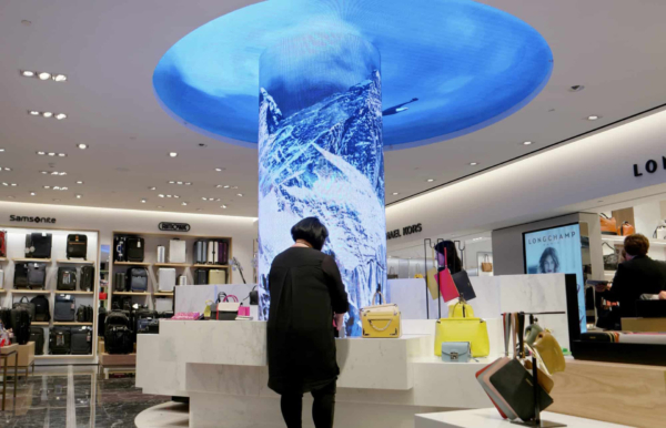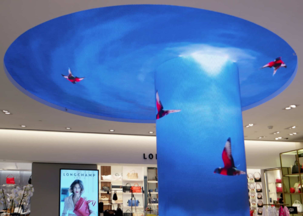 Op dit scherm speelt een loop van 10 minuten aan bewegend beeld, ontworpen door motion designer Eline Wieland. Het werk, getiteld Connecting Worlds – Head in the Clouds, toont Hollandse wolkenluchten als drager van een reis door natuur, werelddelen en emoties. De titel verwijst naar zowel het reizen als het dromerige van shoppen in transit.