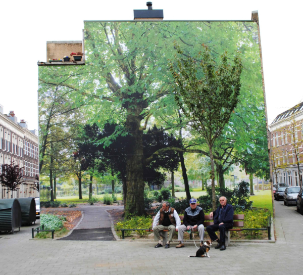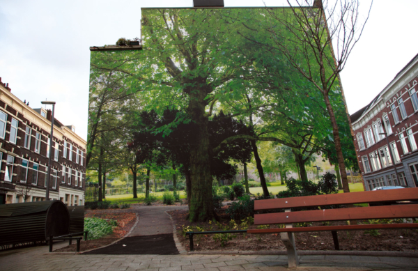 Op een grote fotomuur werd een levensechte afbeelding geplaatst van een tuin met bomen, struiken en een wandelpad. Aan de voet van de muur werd een echt plantsoen aangelegd met beplanting die ook in het originele park voorkomt. Dit creëert de illusie dat je zo het park in kunt lopen, een verrassende groene oase midden in de stad.