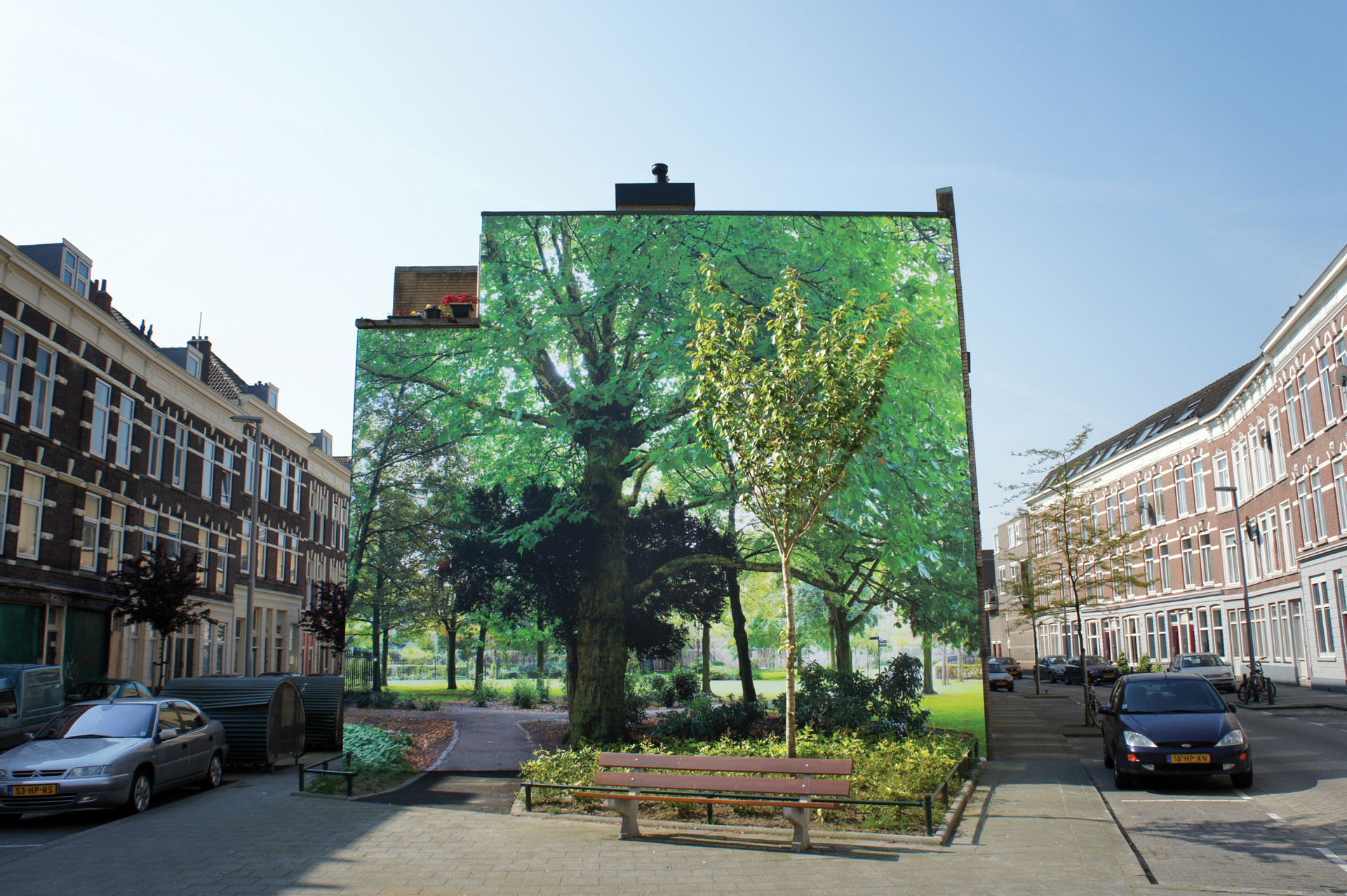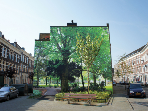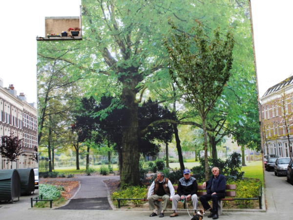 Op een grote fotomuur werd een levensechte afbeelding geplaatst van een tuin met bomen, struiken en een wandelpad. Aan de voet van de muur werd een echt plantsoen aangelegd met beplanting die ook in het originele park voorkomt. Dit creëert de illusie dat je zo het park in kunt lopen, een verrassende groene oase midden in de stad.