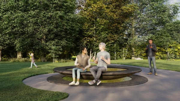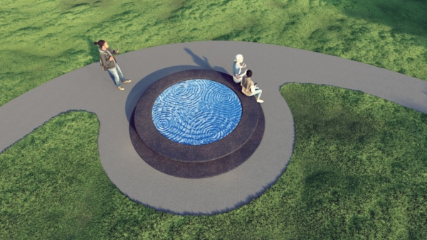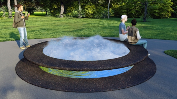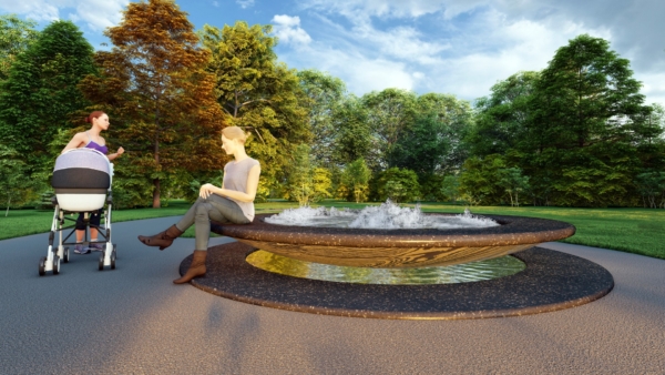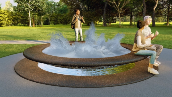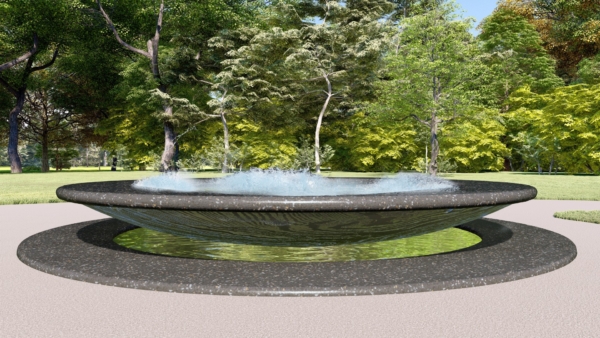De schaal wordt omringd door een zitobject van terrazzo en RVS. Van een afstand lijkt het water te zweven en ontstaat er door licht, spiegeling en beweging een dromerige dieptewerking. De bron is interactief zonder technologie: er zijn geen knoppen of schermen — alleen de directe ervaring van het water, het geluid, het licht en de zindering.