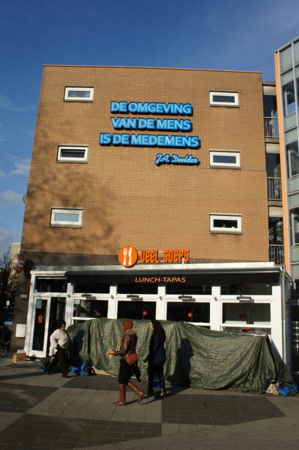 In het hart van Rotterdam, op Nieuwe Binnenweg 125, prijkt sinds 2011 een poëtisch eerbetoon aan stadsheld Jules Deelder: “De omgeving van de mens is de medemens.” Deze treffende dichtregel, uitgevoerd in blauw neon, werd op initiatief van Rabobank Rotterdam en de Gemeente Rotterdam gerealiseerd. Mothership trad hierbij op als producent.