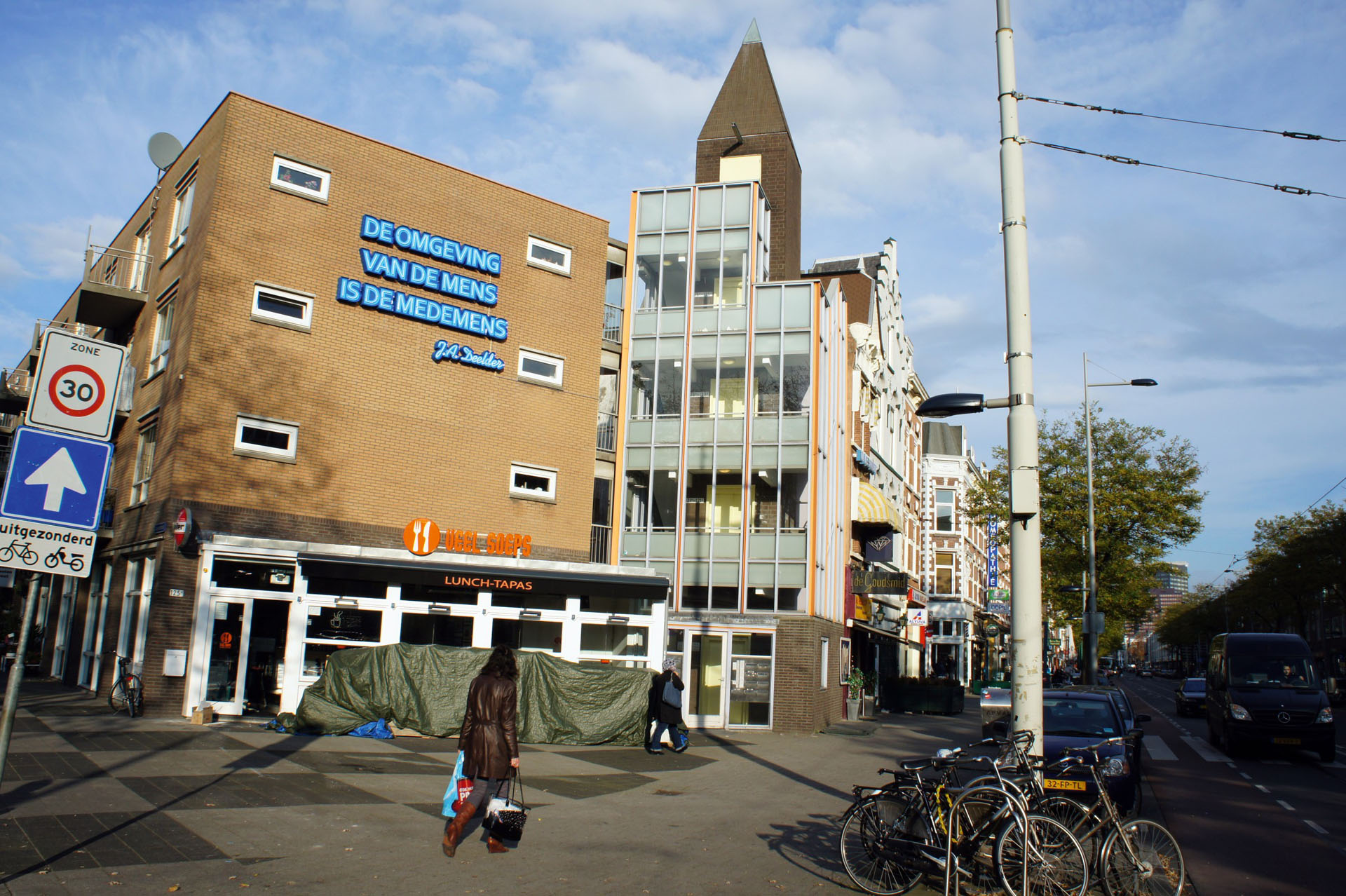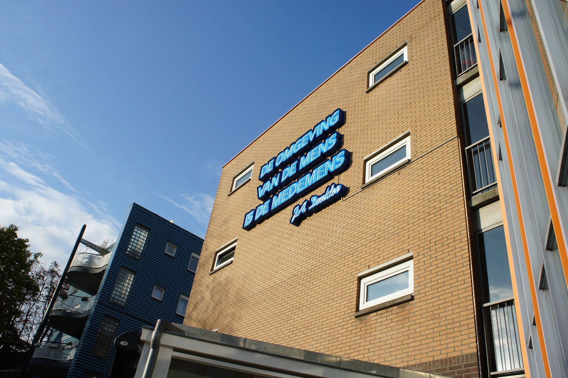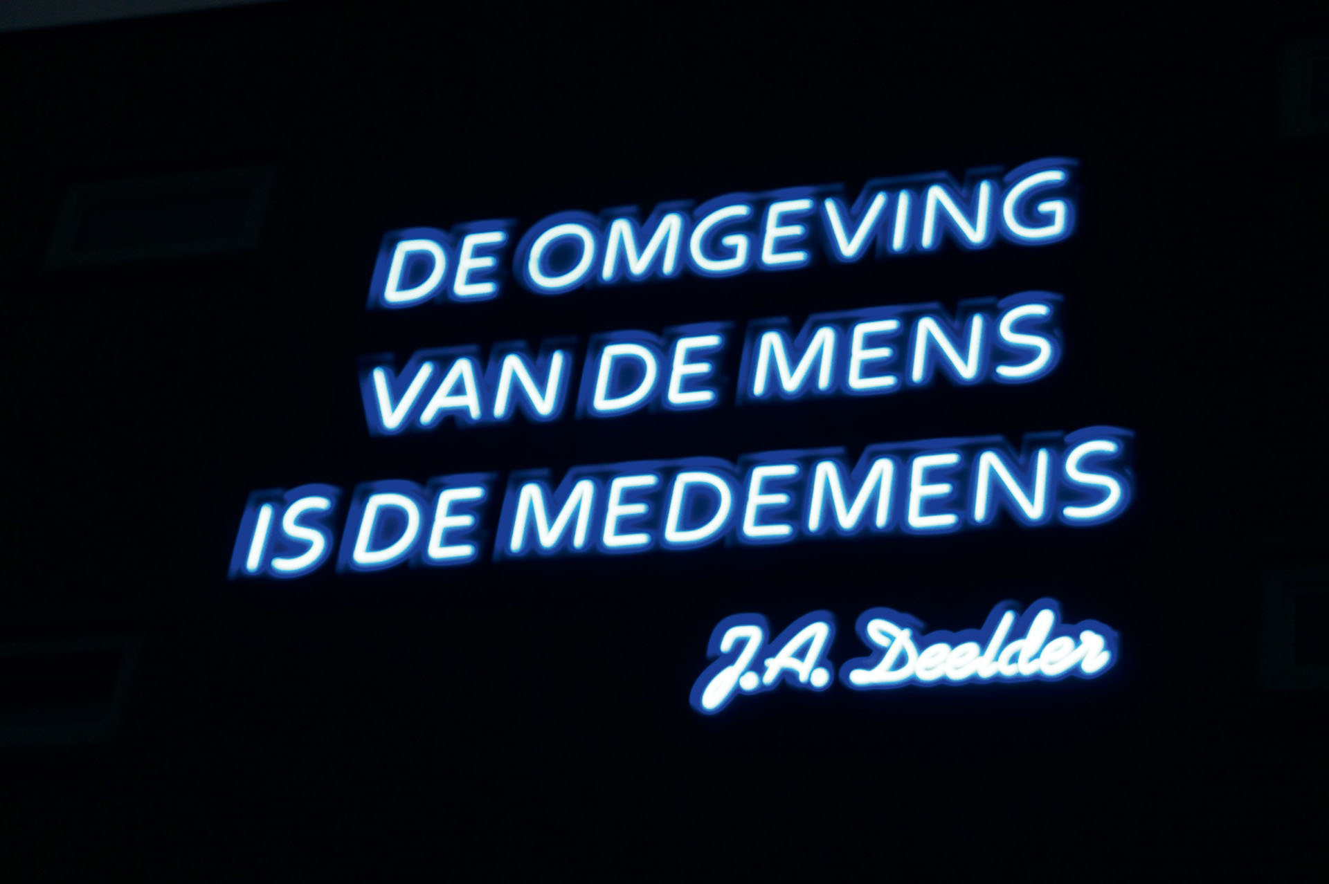In het hart van Rotterdam, op Nieuwe Binnenweg 125, prijkt sinds 2011 een poëtisch eerbetoon aan stadsheld Jules Deelder: “De omgeving van de mens is de medemens.” Deze treffende dichtregel, uitgevoerd in blauw neon, werd op initiatief van Rabobank Rotterdam en de Gemeente Rotterdam gerealiseerd. Mothership trad hierbij op als producent.