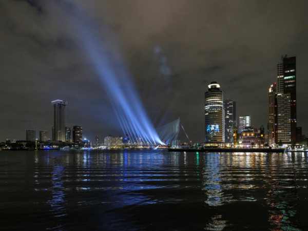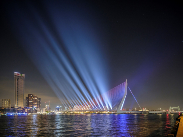 Vanaf de Erasmusbrug — hét icoon van Rotterdam — stegen 64 witte lichtbundels op, als vleugels van een vogel die zich klaarmaakte om uit te vliegen. Elke avond tussen 22.00 en 24.00 uur verlichtte deze symbolische zwaan de stad én Europa, als eerbetoon aan de vrijheid, muziek en eenheid die het Songfestival belichaamt.
