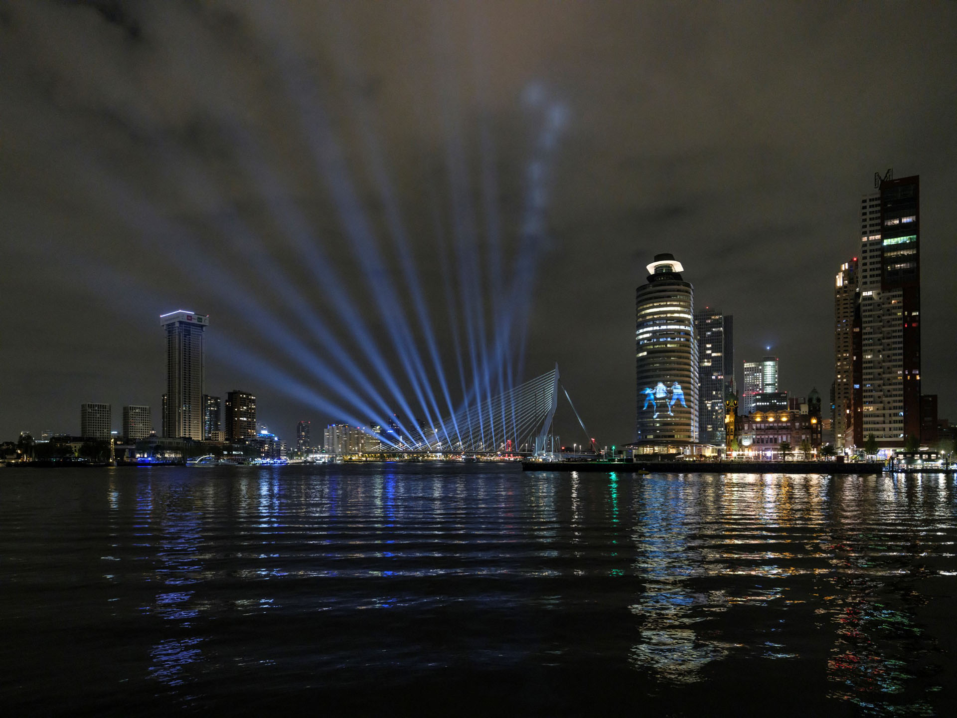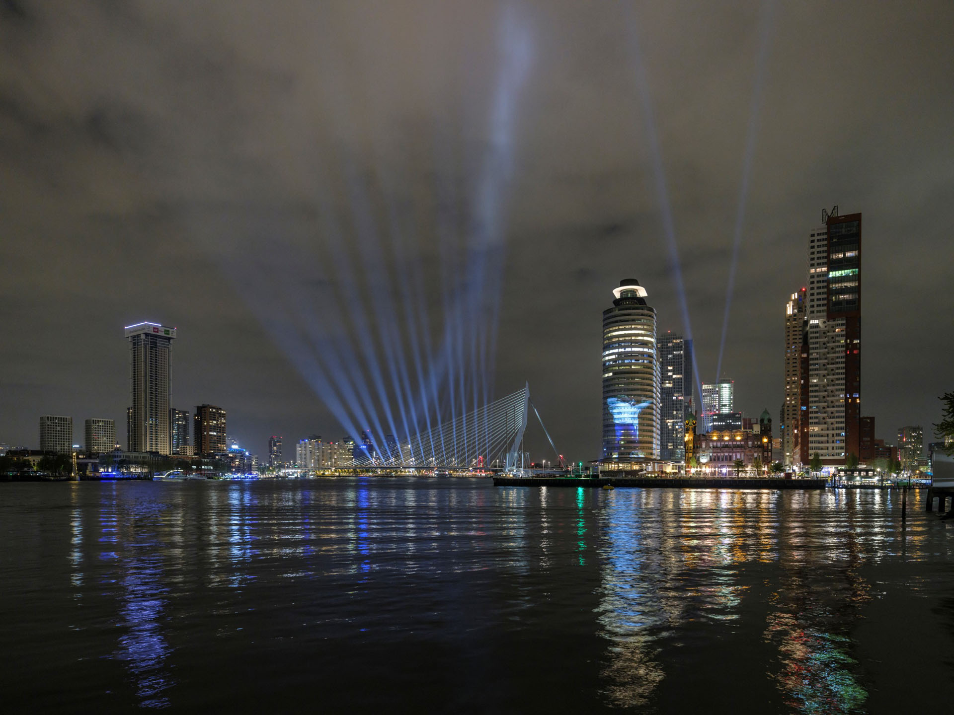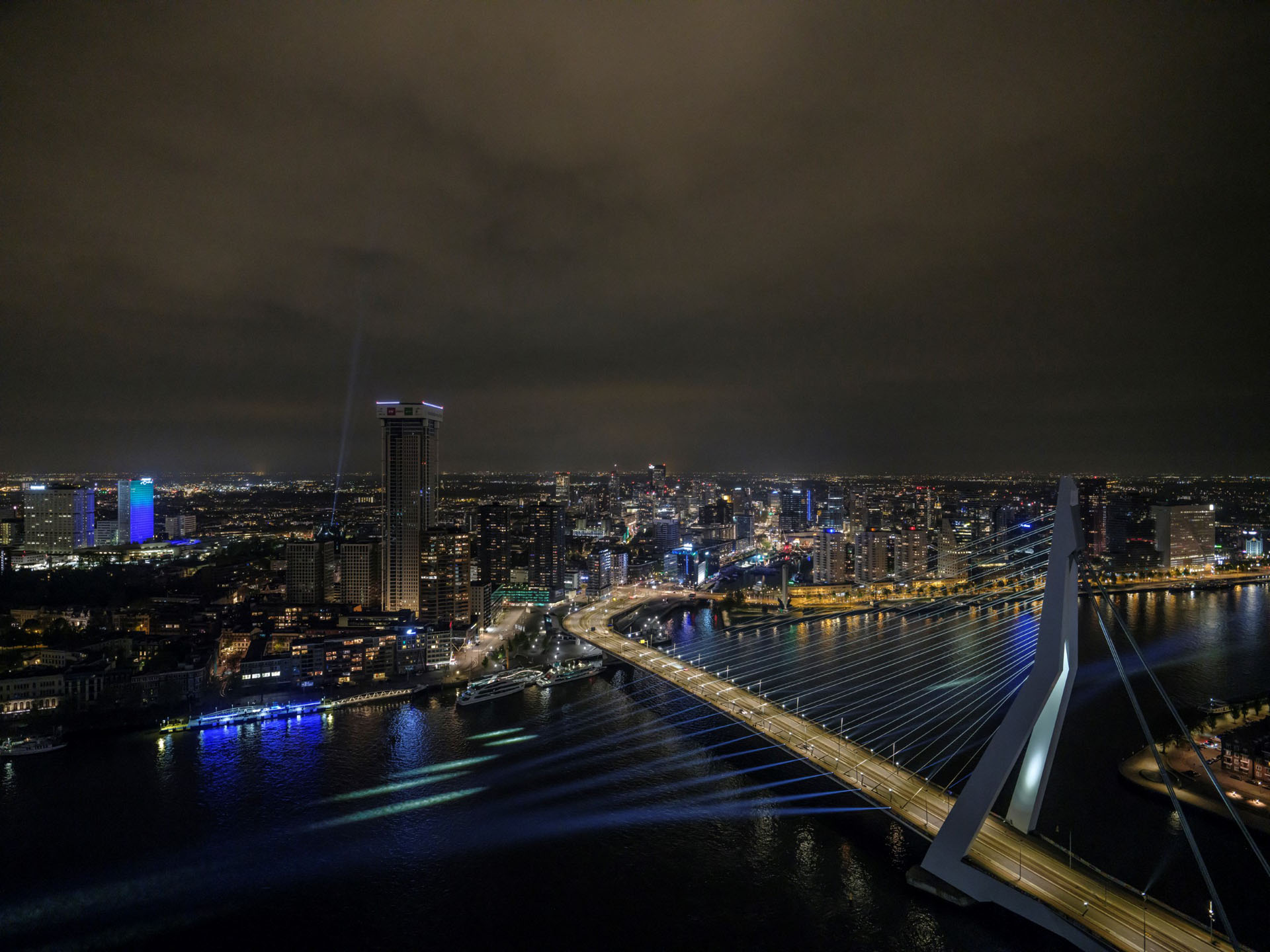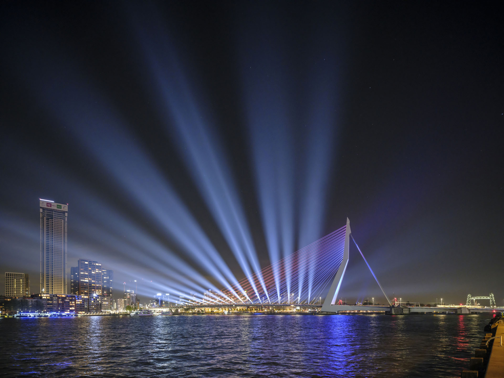 Vanaf de Erasmusbrug — hét icoon van Rotterdam — stegen 64 witte lichtbundels op, als vleugels van een vogel die zich klaarmaakte om uit te vliegen. Elke avond tussen 22.00 en 24.00 uur verlichtte deze symbolische zwaan de stad én Europa, als eerbetoon aan de vrijheid, muziek en eenheid die het Songfestival belichaamt.