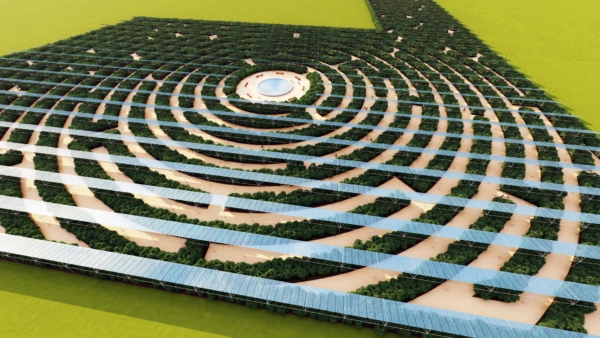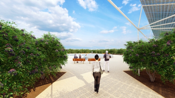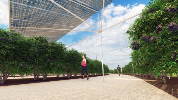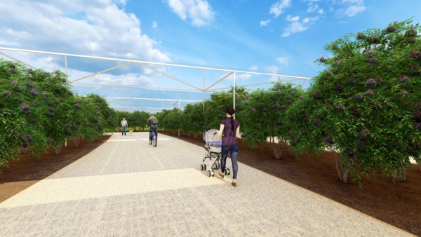 In plaats van de panelen plat op de grond te leggen, worden ze op een hoogte van 3,5 meter geplaatst. Zo ontstaat eronder een beschutte, lichte ruimte — als een openluchtkas — die wordt ingericht als eetbare tuin. Hier groeien rijen met bessenstruiken zoals frambozen, bramen, rode en blauwe bessen, die samen een levend doolhof vormen. Bezoekers worden uitgenodigd om te dwalen, te plukken en te proeven. De slingerende paden leiden naar een open kern, waar zonlicht vrij spel krijgt en een centrale ontmoetingsplek ontstaat met zitplekken en eetbaar groen.