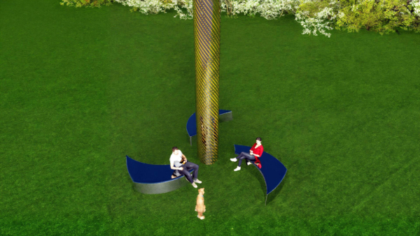 Rondom het landmark worden bankjes geplaatst die niet alleen uitnodigen tot verblijf, maar ook het verhaal van het drielandschappenpunt vertellen. Zo ontstaat een publieke plek die zowel bewoners als bezoekers informeert, verwondert en verbindt.
