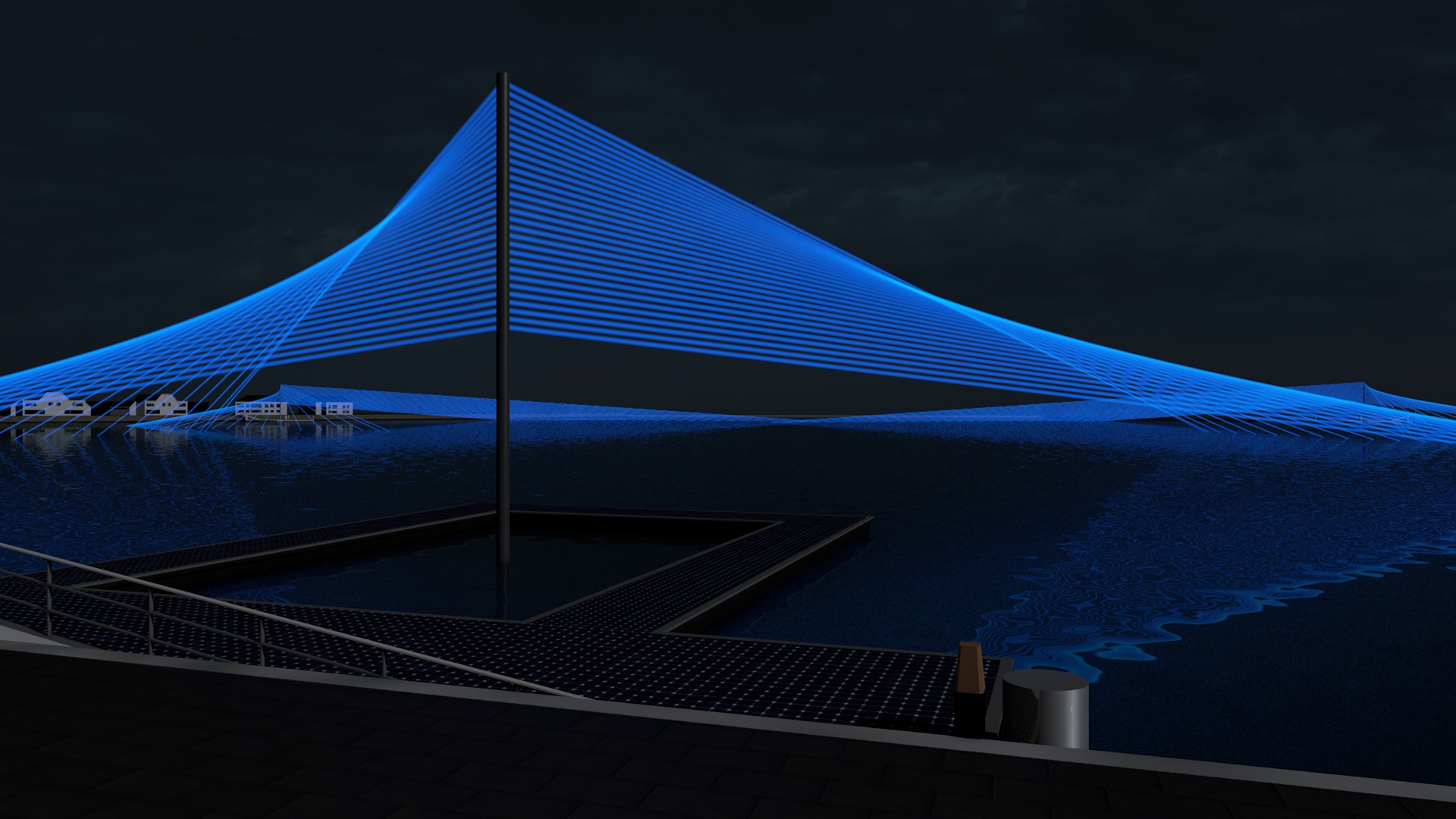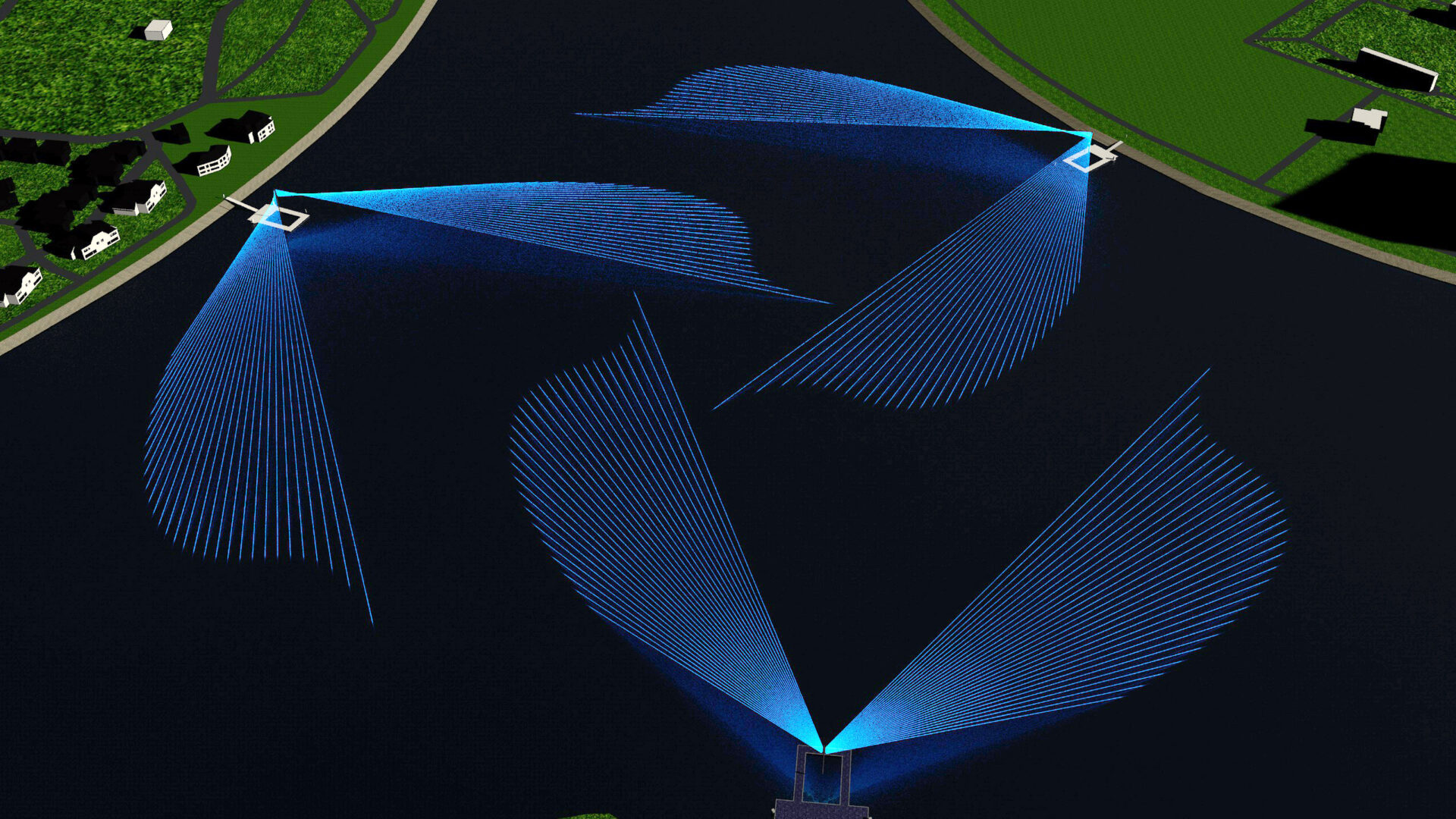 Waar eerder het plan was om drie spectaculaire waterstralen van honderden meters hoog te realiseren, is na technische en veiligheidsbezwaren gekozen voor een vernieuwde benadering. In plaats van water vormen nu krachtige lichtstralen de verbinding tussen drie verblijfspunten aan de kades van de drie steden. Deze lichtfonteinen vormen samen een gelijkzijdige driehoek over het water, die niet alleen visueel indrukwekkend is, maar ook de onderlinge relatie tussen de steden symboliseert.