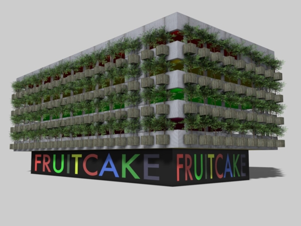 Het gebouw, dat recent volledig gestript is en nu slechts als betonnen skelet overeind staat, wacht op een nieuwe bestemming. In plaats van het pand leeg te laten of af te schermen, stelt Fruitcake voor om de ramen te ontdoen van glas en grote ‘boombakken’ te monteren waarin afgedankte fruitbomen worden geplant. Zo ontstaat een verticale boomgaard: op de eerste verdieping appelbomen, daarboven peren, vervolgens pruimen, en op het hoogste niveau — de letterlijke kers op de taart — kersenbomen.