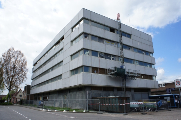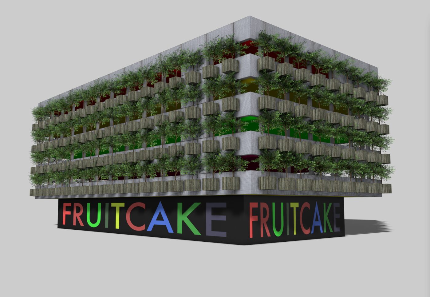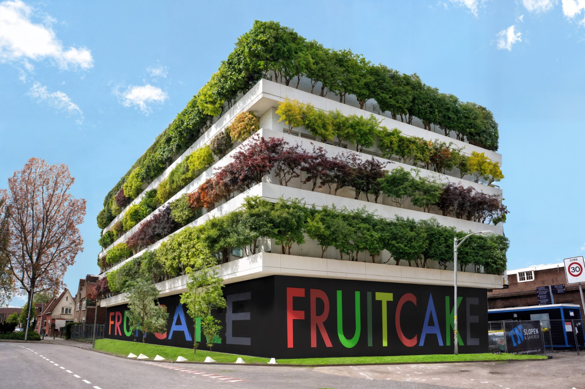 Het gebouw, dat recent volledig gestript is en nu slechts als betonnen skelet overeind staat, wacht op een nieuwe bestemming. In plaats van het pand leeg te laten of af te schermen, stelt Fruitcake voor om de ramen te ontdoen van glas en grote ‘boombakken’ te monteren waarin afgedankte fruitbomen worden geplant. Zo ontstaat een verticale boomgaard: op de eerste verdieping appelbomen, daarboven peren, vervolgens pruimen, en op het hoogste niveau — de letterlijke kers op de taart — kersenbomen.