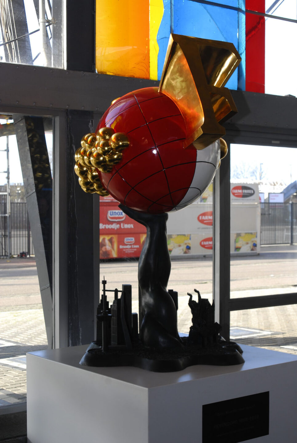 Het kunstwerk is 2,5 meter hoog en 6,3 meter breed, gemaakt van brons, afgewerkt met bladgoud en met de hand beschilderd. Op 19 juli 2008 werd het feestelijk onthuld in Stadion Feyenoord, beter bekend als De Kuip. Ter gelegenheid van dit jubileum zijn er ook twintig kleine replica’s van het beeld gemaakt, die door de grootste fans zijn aangeschaft.