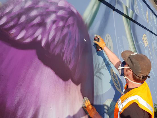 Collin werkte wekenlang op de smalle strook tussen vangrail en scherm, met kwast en verf te midden van verkeer en verbaasde voorbijgangers. Het resultaat: een uitgestrekt werk van bijna 200 meter dat niet alleen het dorp letterlijk op de kaart zet, maar ook laat zien wat kunst kan doen in de openbare ruimte.