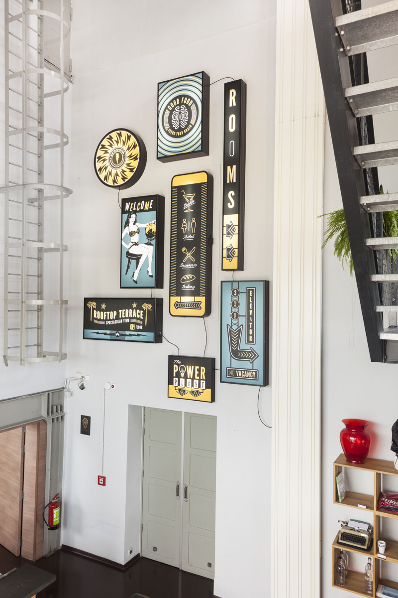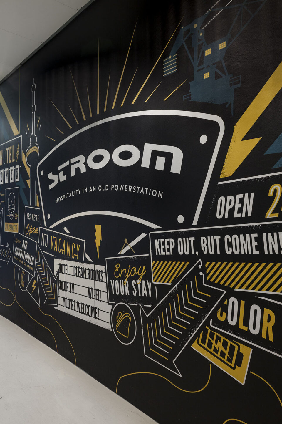 De platen in de lichtbakken zijn voorzien van grafische illustraties die de gasten op een creatieve manier de weg wijzen naar onder andere de wc, brasserie, lift, kamers en het dakterras. Dit werk past naadloos binnen de vernieuwde visuele identiteit van STROOM, waarin ook het logo en de website een opfrisbeurt kregen.