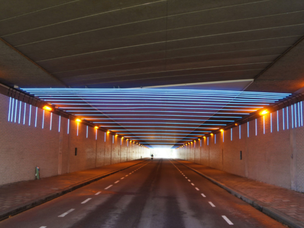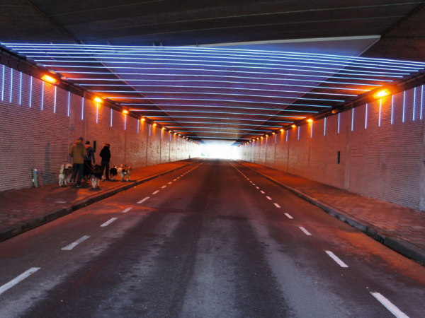 Langs de 120 meter lange en 12 meter brede tunnel werden LED-strips aangebracht in een steeds kleiner wordend interval richting de uiteinden. Deze opstelling creëert een visueel effect van versnelling, wat paradoxaal genoeg bestuurders ertoe aanzet om juist langzamer te rijden. Hierdoor ontstaat niet alleen een rustiger verkeersbeeld, maar wordt ook de beleving voor voetgangers en andere gebruikers veiliger en aangenamer. De ritmische verlichting werkt als een onzichtbare verkeersregelaar en maakt van een donkere, onveilige doorgang een futuristische ervaring die uitnodigt tot respectvol gebruik van de ruimte.