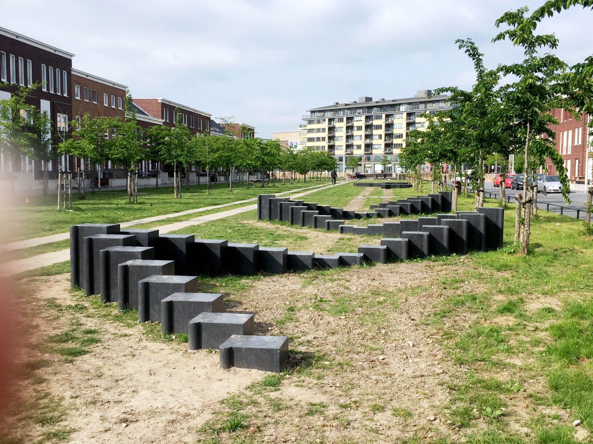 Het staat aan de André Voltenlaan in Utrecht, een plek die in de toekomst zal uitgroeien tot een nieuw stadsdeel, Leidsche Rijn. De omgeving kenmerkt zich door moderne, strakke architectuur en een groen, open gebied met gras, bomen, tafels en stoelen. Het kunstwerk verwijst naar de historische silhouetten van de huizen en het kasteel, met een speelse benadering van een traditionele trap- en klokgevel. Het gebruik van terrazzo in een geometrisch ontwerp herinnert aan de stijl van André Volten, maar bevat ook elementen die typisch zijn voor het werk van Maze de Boer. Het kunstwerk nodigt uit om de vormen te volgen of te genieten van het zonnetje terwijl je erop zit of ligt.