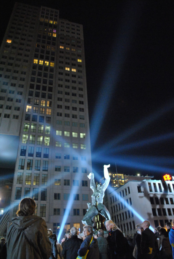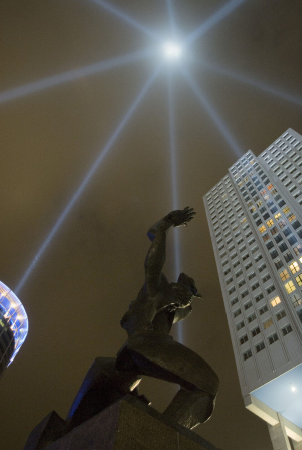 Deze ‘Krans om Zadkine’ gaf het iconische beeld letterlijk en figuurlijk een nieuw perspectief. De krachtige lichtstralen vormden een sereen maar krachtig eerbetoon aan de vernietiging van de stad én haar wederopbouw. Het was een ingetogen, visueel gedenkteken dat Rotterdam verbond met haar verleden, zonder woorden, maar met licht.
