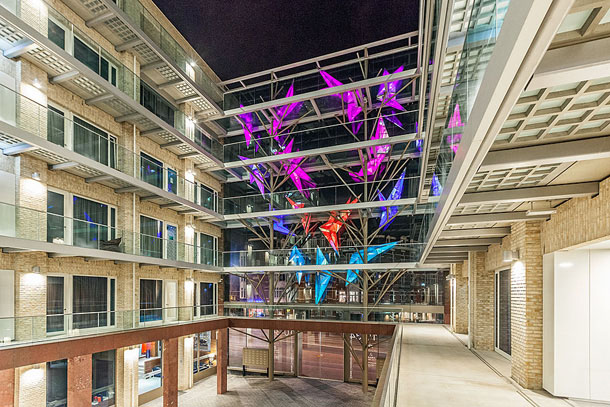 In de imposante entreehal van het Amsterdamse gebouw Solid 11, ontworpen door architect Tony Fretton, schittert het kunstwerk Kristal Growth van kunstenaar Hans van Bentem. In opdracht van woningcorporatie Stadgenoot ontwierp Van Bentem vijftien kristalvormige objecten die doen denken aan de bladeren van een boom. Deze spiegelende kristallen, gemaakt van one-way vision glas, zijn gemonteerd op boomachtige metalen structuren. Het kunstwerk, met een indrukwekkend formaat van 25 meter hoog en 15 meter breed, krijgt ‘s avonds een magische dimensie door de RGB-ledverlichting die de kristallen doet oplichten als juwelen in de nacht.