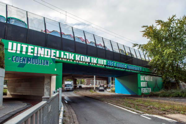 Het Muizengaatje, de spoorwegonderdoorgang aan de Bergweg-Straatweg in Rotterdam, werd door de deelgemeentes Noord en Hillegersberg-Schiebroek aangewezen voor een kunstzinnige transformatie. Threesome (Marjon van der Velden, Gino Catshoek en Kim Visser) kwam met het winnende ontwerp, waarin zij twee lokale iconen verbeeldden: voetballegende Coen Moulijn uit Noord en Hillegonda, de mythische grondlegger van Hillegersberg.
