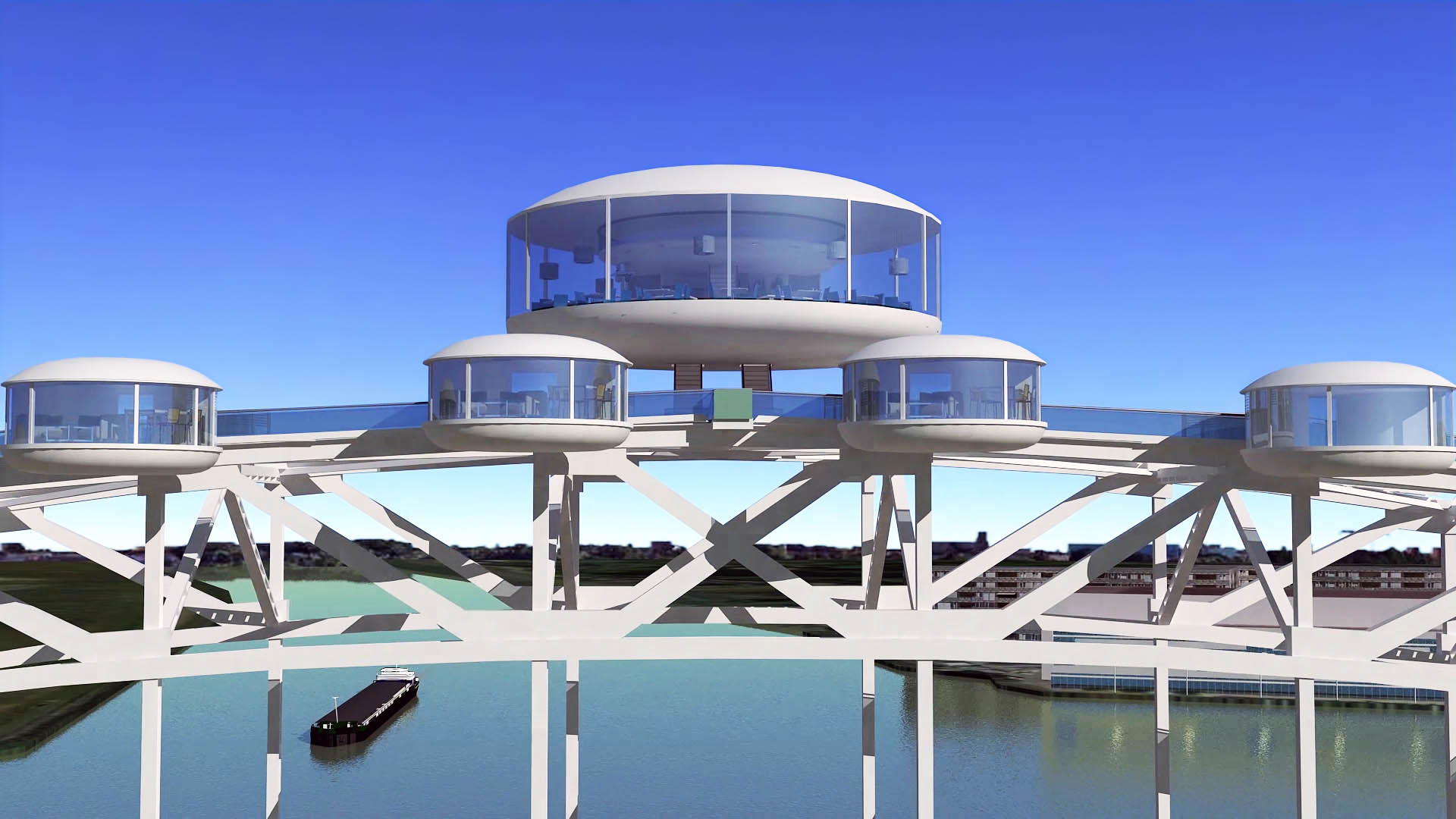 Het oorspronkelijke idee, ontstaan vanuit kunstenaar/architect John Körmeling en verder ontwikkeld door Mothership, voorziet in een aantal futuristische hotelcapsules die aan de brugboog bevestigd worden. Deze capsules worden via een liftende gondel bereikt en bieden unieke verblijven met panoramisch uitzicht over de rivier, het Drechtstedengebied en de molens van Kinderdijk. Op het hoogste punt van de brug zou een restaurant of uitzichtplatform kunnen verrijzen — een plek waar historie en toekomst samenkomen in een absurdistisch en esthetisch gebaar.