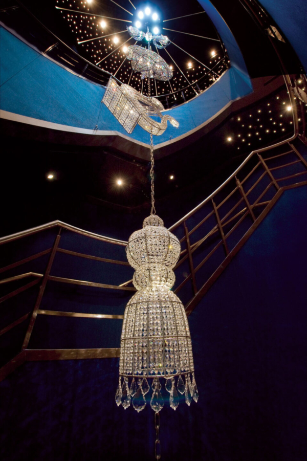 De kroonluchters zijn vervaardigd uit materialen als porselein, kristal en glas, en nemen verrassende vormen aan: van zeepaardjes en octopussen tot abstracte composities die verwijzen naar zeevaart en mythische wezens. Elk werk is op maat gemaakt voor zijn specifieke plek aan boord en sluit naadloos aan bij de sfeer en thematiek van de ruimtes waarin ze hangen.