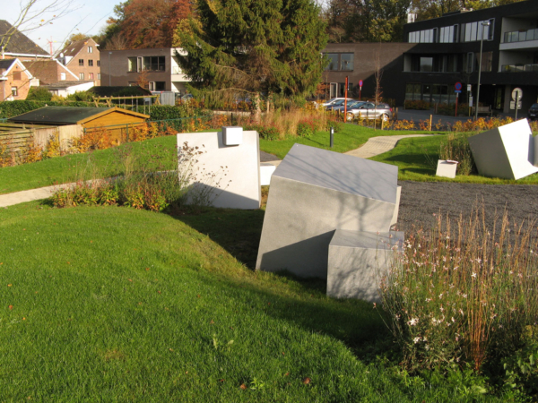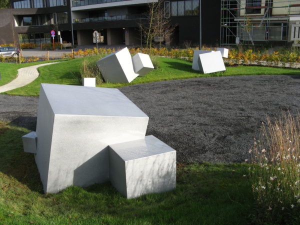 Deze goudkleurige vormen, vervaardigd uit EPS en polyurea, nodigen uit tot ontmoeting, ontspanning en interactie – een fysieke en mentale oase in de dagelijkse leefomgeving van bewoners en bezoekers.