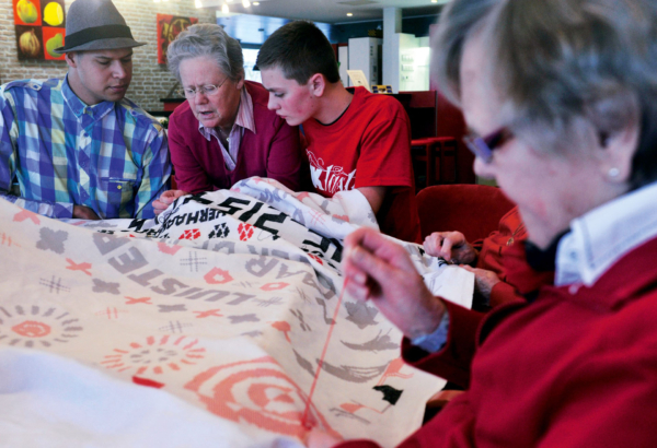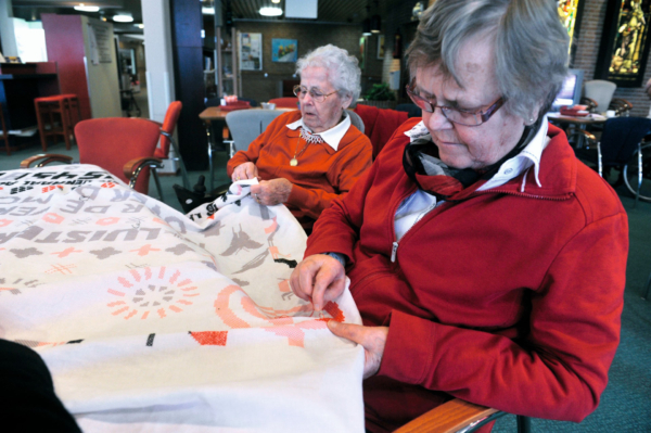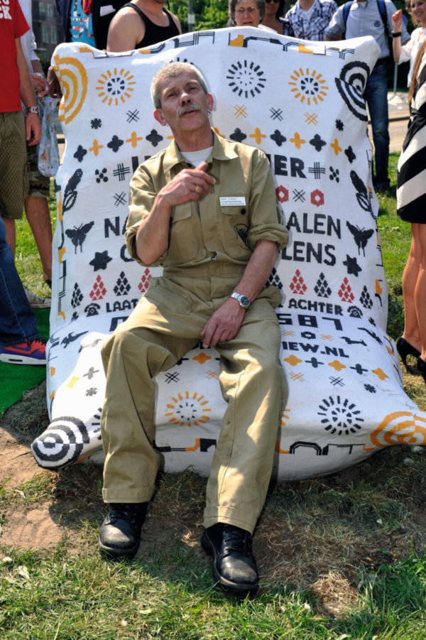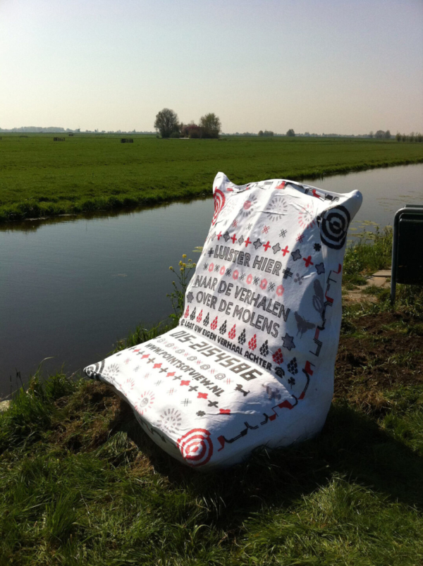 Bezoekers konden op deze geborduurde objecten plaatsnemen en via een inbelnummer luisteren naar het verhaal van de molen waar ze naar keken. Ook konden ze hun eigen herinneringen of verhalen inspreken. De bekleding van de objecten werd gemaakt in de stijl van een oud-Hollandse merklap, met hulp van een grote groep enthousiaste borduurliefhebbers, jong én oud.