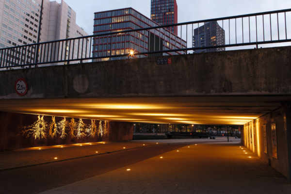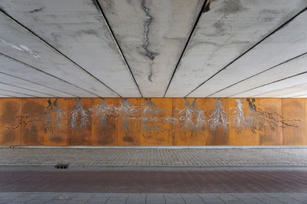 In een cortenstalen wand zijn wortelvormige uitsneden gemaakt die samen het woord “ROTTE-DAM” vormen. Vooral in de avonduren komt het werk tot leven, wanneer licht vanuit de vloer de uitgesneden vormen verlicht en zo een krachtige visuele link legt met de historische wortels van de stad.Het kunstwerk meet 2,5 meter in hoogte en is 26 meter breed.