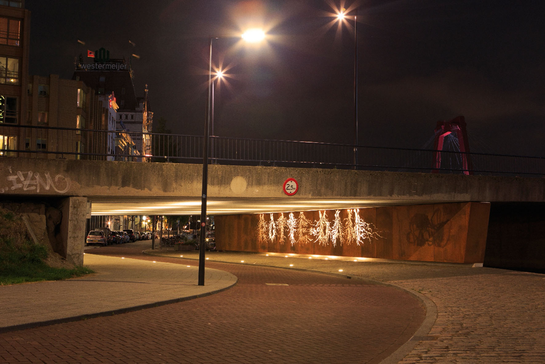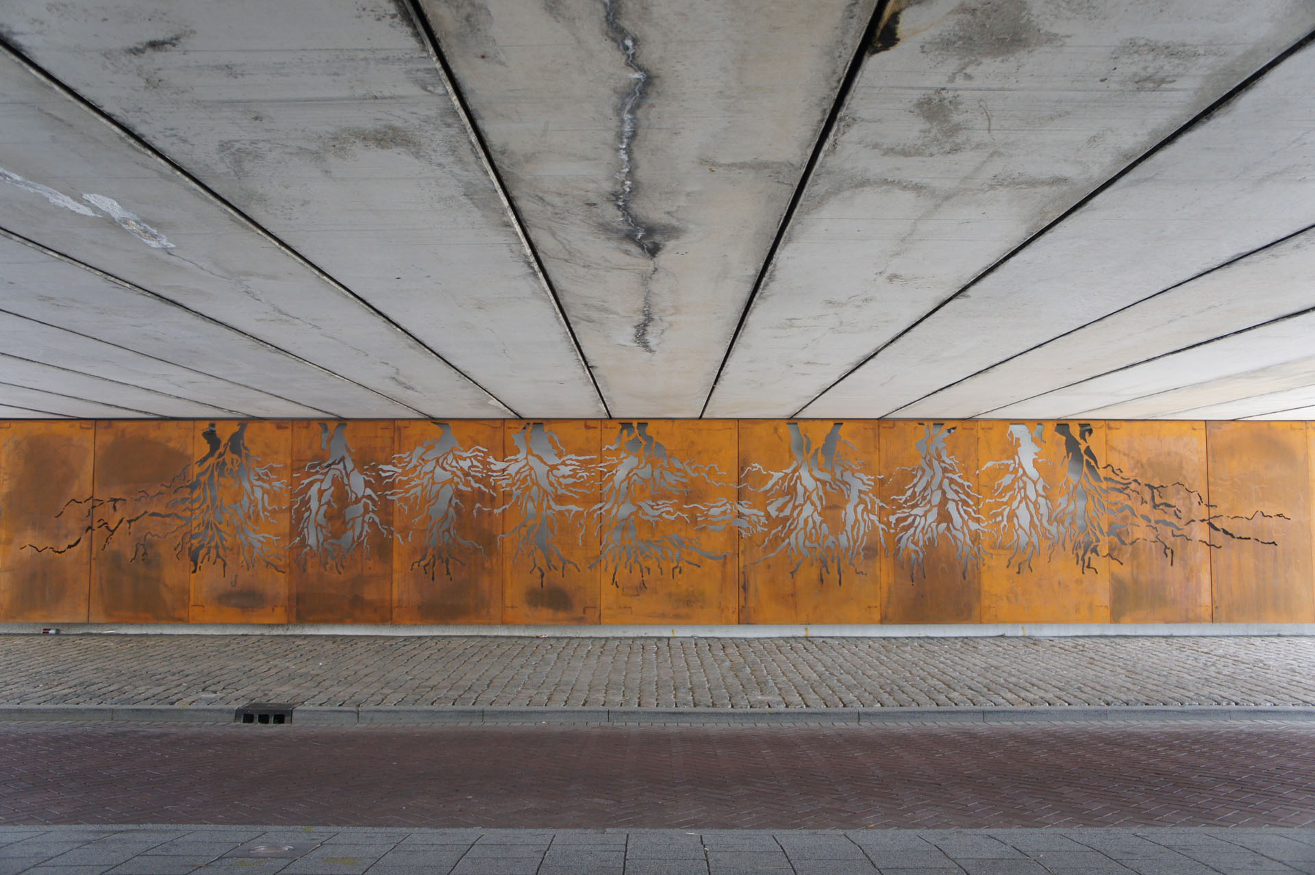 In een cortenstalen wand zijn wortelvormige uitsneden gemaakt die samen het woord “ROTTE-DAM” vormen. Vooral in de avonduren komt het werk tot leven, wanneer licht vanuit de vloer de uitgesneden vormen verlicht en zo een krachtige visuele link legt met de historische wortels van de stad.Het kunstwerk meet 2,5 meter in hoogte en is 26 meter breed.