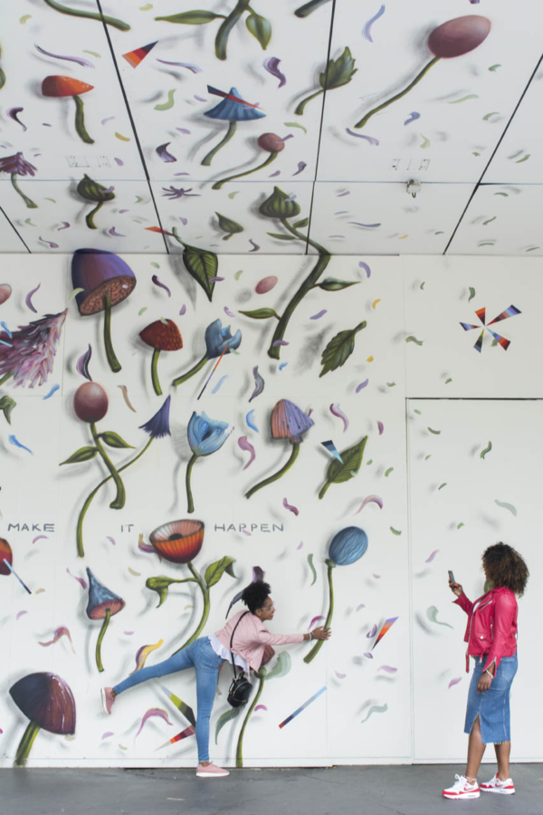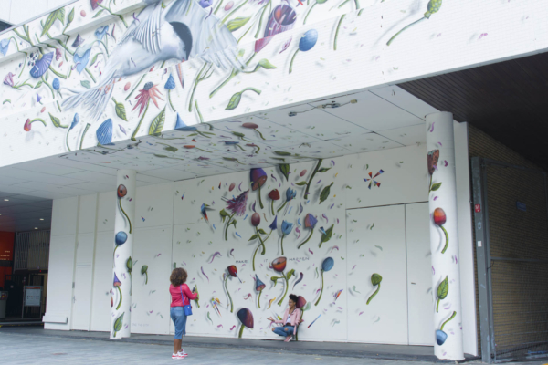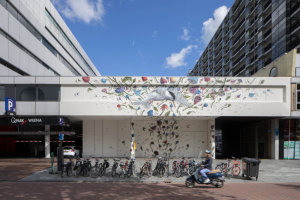 Van der Sluijs’ schildering toont een dromerige wereld vol bloemen en vogels, waarin een grote schommel visueel de hoofdrol speelt. Bezoekers kunnen daadwerkelijk plaatsnemen op een échte schommel die is aangebracht voor de schildering, waardoor ze letterlijk onderdeel worden van het kunstwerk. Dit speelse en poëtische element nodigt uit tot interactie, reflectie en natuurlijk: het maken van een foto.