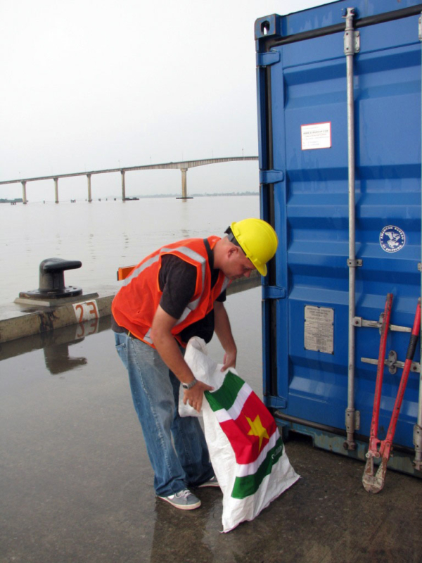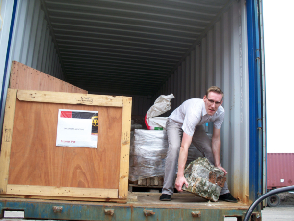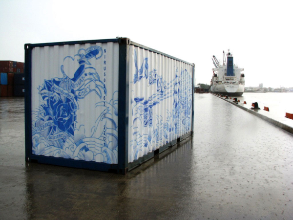 Coley’s oorspronkelijke idee was om deze historische stenen terug te halen vanuit hun nieuwe thuislanden. Omdat veel ervan inmiddels tot beschermd erfgoed behoorden, koos hij voor een symbolisch alternatief: circa 6.000 authentieke stenen uit Nederland maakten dezelfde reis als hun voorgangers. In een opvallend Delftsblauwe zeecontainer, ontworpen door Studio Léon&Loes, reisden de stenen via Singapore, Australië, Suriname en Sint Eustatius om uiteindelijk in Amsterdam tot muur te worden opgetrokken.