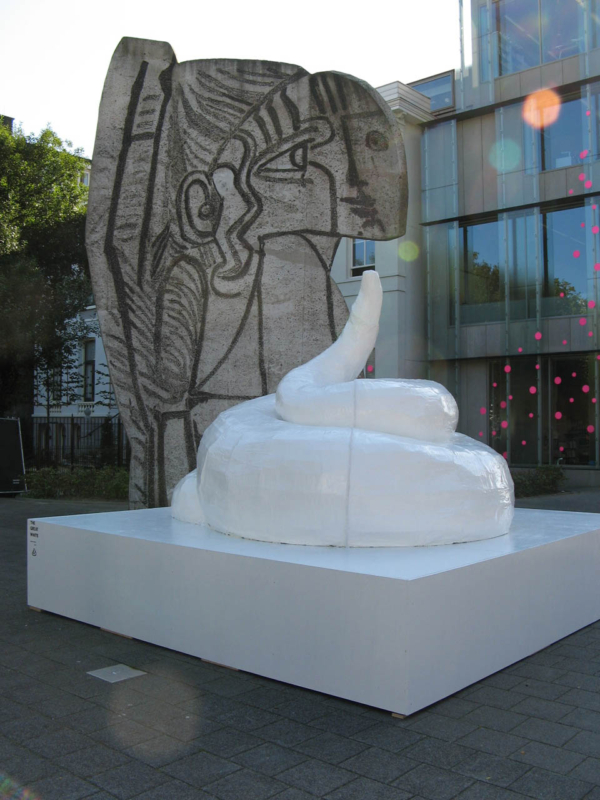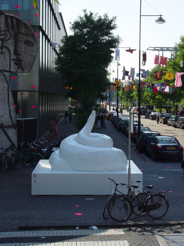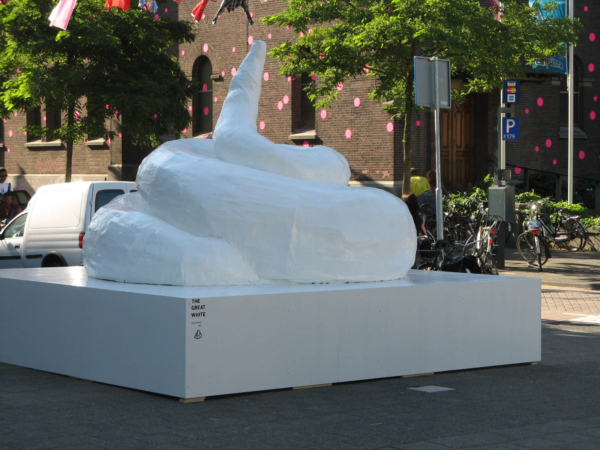 The Great White fungeerde als visueel ankerpunt en subtiele kritiek op de pretenties van de kunstwereld. Want wie bepaalt eigenlijk wat waardig is om op een sokkel te staan? En is het niet juist in het banale dat we onze grootste waarheden vinden?