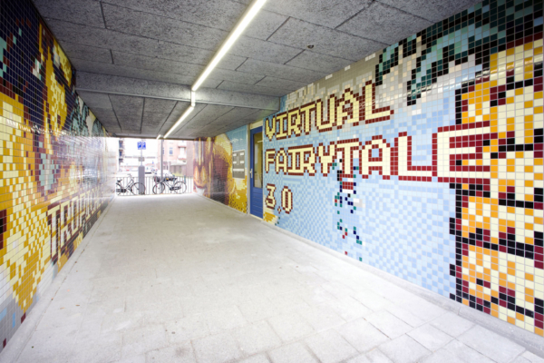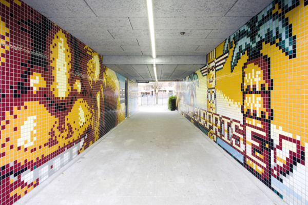 Het resultaat is een sprankelend tegelmozaïek van keramische tegeltjes van 5×5 cm, dat niet alleen een knipoog is naar retro gamecultuur, maar ook een kleurrijke ode aan de multiculturele sfeer van de wijk. De afmetingen zijn indrukwekkend: twee wanden van elk 12,5 bij 2,7 meter.