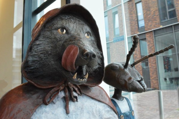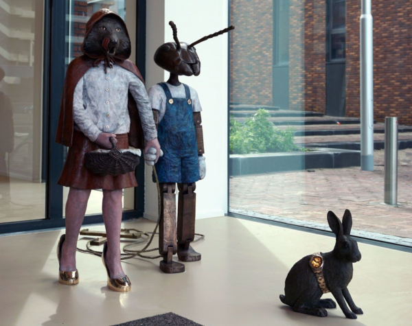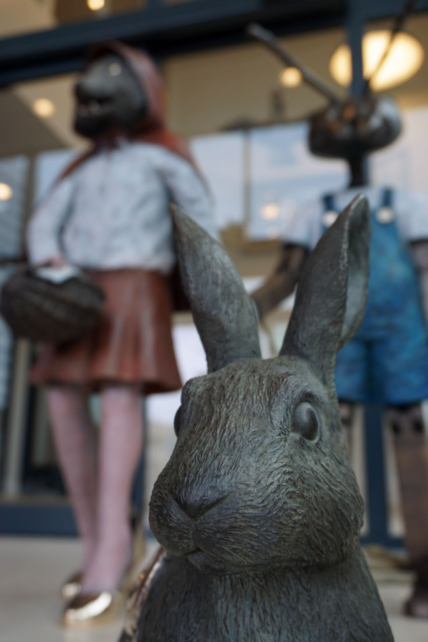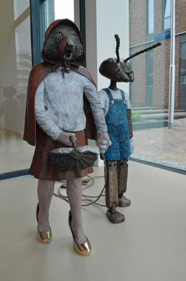 De in brons gegoten sculpturen tonen bekende figuren als Pinokkio, Roodkapje, de kikker, het konijn en Nils Holgersson – maar niet zoals je ze kent. Ze ogen nét iets minder liefelijk, alsof ze rechtstreeks uit een alternatieve realiteit zijn gestapt. Nils Holgersson zweeft zelfs op een zwaan door een raamkozijn, ogenschijnlijk uit een andere dimensie.