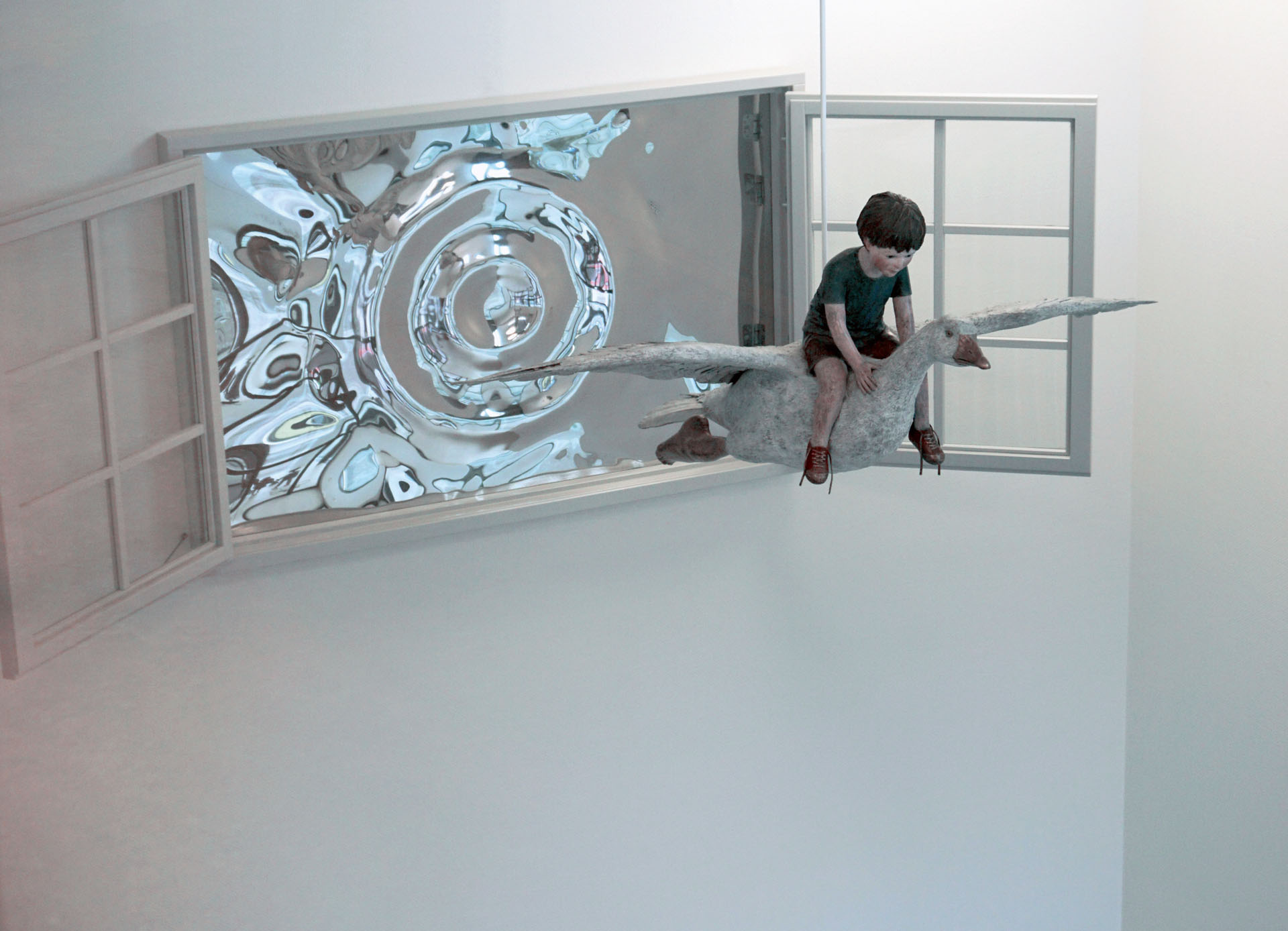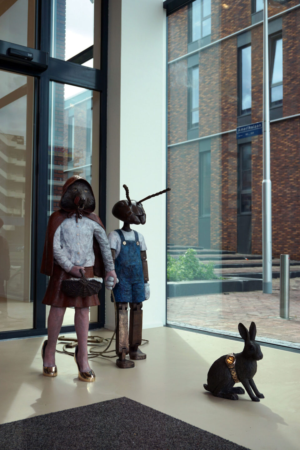 De in brons gegoten sculpturen tonen bekende figuren als Pinokkio, Roodkapje, de kikker, het konijn en Nils Holgersson – maar niet zoals je ze kent. Ze ogen nét iets minder liefelijk, alsof ze rechtstreeks uit een alternatieve realiteit zijn gestapt. Nils Holgersson zweeft zelfs op een zwaan door een raamkozijn, ogenschijnlijk uit een andere dimensie.