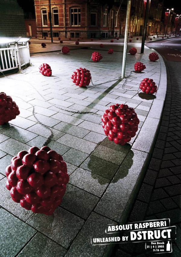 In de vroege ochtend van 21 juni 2005 kleurde Den Bosch onverwacht rood. Niet door de opkomende zon, maar dankzij een guerrilla-actie van Dstruct, in samenwerking met Mothership, ter ere van de lancering van Absolut Raspberri – de nieuwe wodka met frambozensmaak van Absolut Vodka. Op een verlaten straat verschenen plotseling reusachtige, met kettingen vastgelegde frambozen van polyester. Als surrealistische objecten in de stad gaven ze een absurdistische draai aan de publieke ruimte en verbeeldden ze op theatrale wijze de losbarsting van smaak.