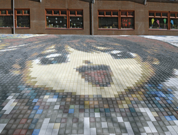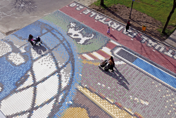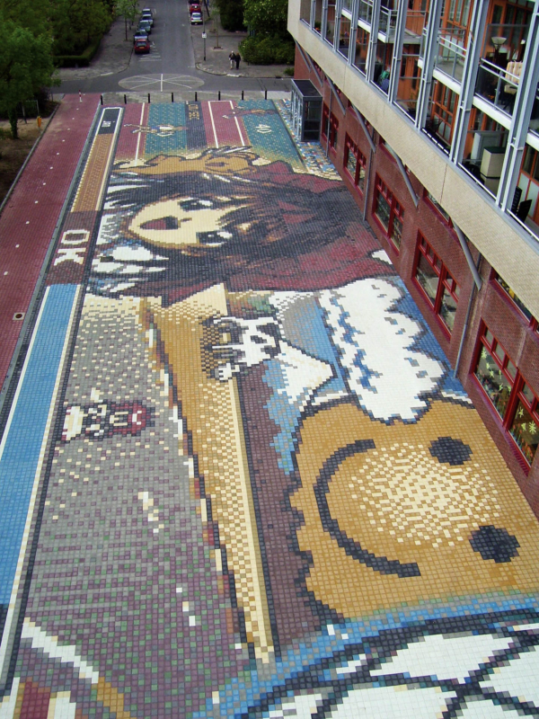 Het mozaïek bestaat uit gekleurde betontegels van 15×15 cm en strekt zich uit over een indrukwekkende oppervlakte van circa 20 bij 64 meter, waardoor het zelfs zichtbaar is op Google Earth. In het ontwerp zijn wensen van de betrokken partijen verwerkt, resulterend in een vrolijk en dynamisch beeld vol hedendaagse sprookjesfiguren die zijn geïnspireerd op computergames. Daarmee sluit het kunstwerk perfect aan op de leefwereld en verbeeldingskracht van de kinderen die het gebouw dagelijks bezoeken.